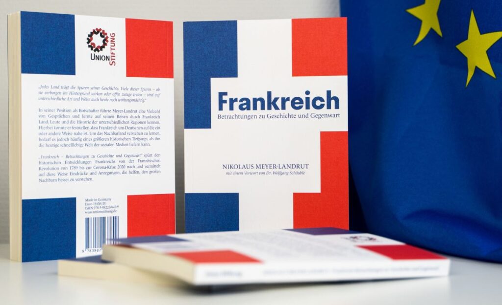 Bei der Union Stiftung ist das neue Buch von Nikolaus Meyer-Landrut mit dem Titel „Frankreich – Betrachtungen zu Geschichte und Gegenwart“ erschienen. Das Vorwort verfasste Bundestagspräsident Dr. Wolfgang Schäuble. Das Werk ist ab sofort im Buchhandel erhältlich. Die Online-Buchvorstellung mit dem Autor findet am Donnerstag, dem 05. November 2020, um 14 Uhr statt und wird über Zoom (https://zoom.us/j/97316914051, Webinar-ID: 973 1691 4051) sowie die Facebookseite der Union Stiftung gestreamt.