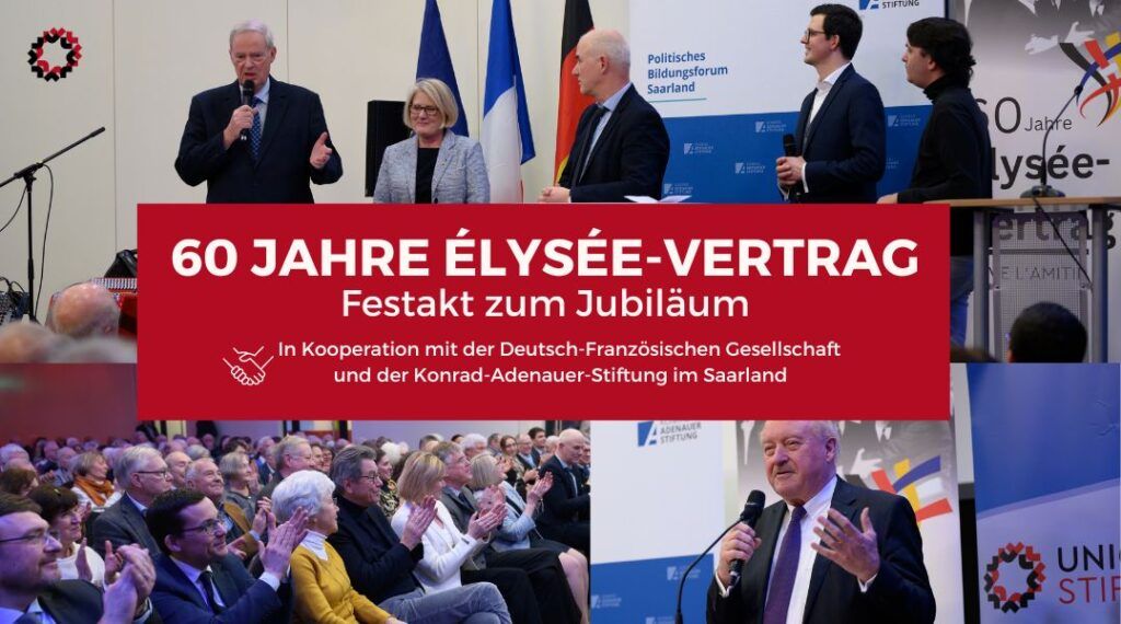 Saarbrücken – Vor rund 350 Gästen hat die Union Stiftung gemeinsam mit der Deutsch-Französischen Gesellschaft und dem Politischen Bildungsforum Saarland der Konrad-Adenauer-Stiftung im Saarrondo das Jubiläum 60 Jahre Élysée-Vertrag gefeiert.