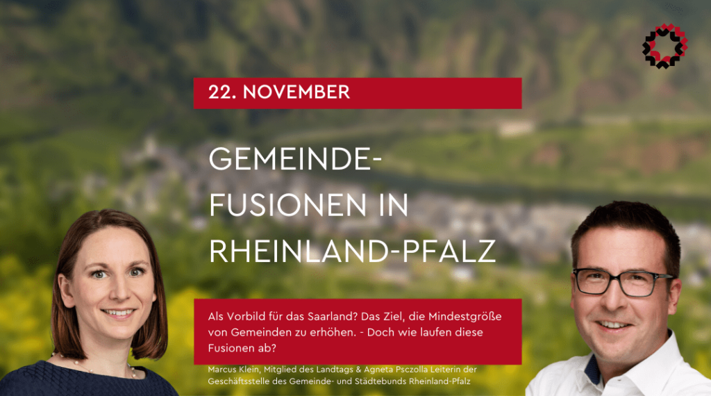 Wie laufen diese Fusionen ab? Welche Schwierigkeiten ergeben sich im Umfeld dieser Fusionen und welche Chancen stecken in diesem Prozess? Und: können diese Fusionen auch Vorbild für das Saarland sein? Darüber sprechen Marcus Klein, Mitglied des Landtags in Rheinland-Pfalz (CDU) und Agneta Psczolla Leiterin der Geschäftsstelle des Gemeinde- und Städtebunds Rheinland-Pfalz. Die Podiumsdiskussion findet am 22. November, um 18.30 Uhr im Haus der Union Stiftung statt.