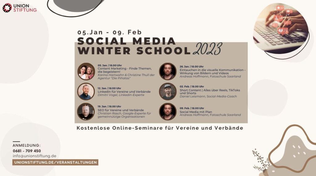 Mit unserer Social Media Winter School bieten wir wieder viele, kostenlose Seminare für Vereine und Verbände rund um das Thema „Social Media und Onlinemarketing“ an.