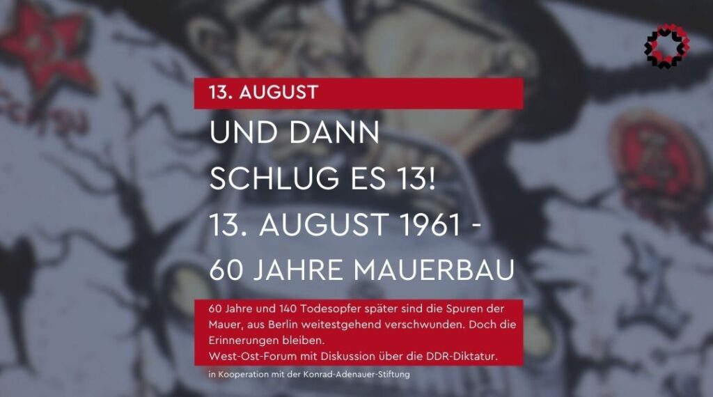 Am Freitag, dem 13. August, um 18.00 Uhr laden die Union Stiftung und die Konrad-Adenauer-Stiftung Saarbrücken zu einem Ost-West-Forum ins Haus der Union Stiftung ein. Referenten sind Dr. Stefan Wolle, Historiker und Wissenschaftlicher Leiter des DDR-Museums Berlin, Dr. Karsten Dümmel, Landesbeauftragter der Konrad-Adenauer-Stiftung für das Saarland, Autor und DDR-Bürgerrechtler, Peter Keup, DDR-Zeitzeuge, Historiker und Mitarbeiter des Forschungsverbunds „Landschaften der Verfolgung“ des Menschenzentrums Cottbus e.V., Stephan Krawczyk, Liedermacher, Autor und DDR-Bürgerrechtler, Roland Theis, Staatssekretär im Ministerium der Justiz und Bevollmächtigter des Saarlandes für Europaangelegenheiten, sowie Markus Uhl, MdB und Generalsekretär der CDU Saar.