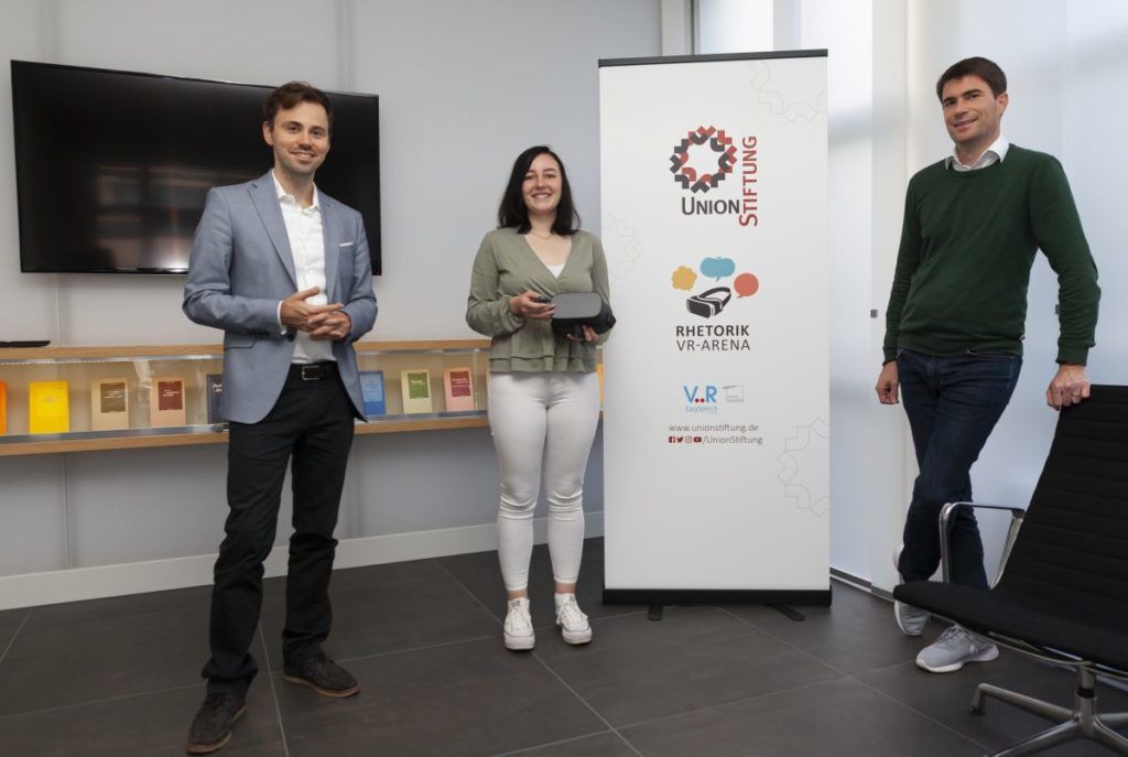 Saarbrücken – Angst vor Präsentationen war gestern. In der VR-Arena der Union Stiftung lassen sich Rhetorikfähigkeiten spielend leicht trainieren – virtuell. Mit einer Virtual-Reality-Brille und einem speziellen Übungsprogramm bietet die Union Stiftung die Möglichkeit, ohne jeden Druck Reden vor einem virtuellen Publikum zu halten. Im Anschluss an jede Übung erhalten die Teilnehmer*innen Feedback, was sie gut gemacht haben und woran sie noch arbeiten müssen. Außerdem gibt es verschiedene Szenarien, mit denen ganz gezielt Fähigkeiten wie Schlagfertigkeit, Blickkontakt oder Gestik trainiert werden können.