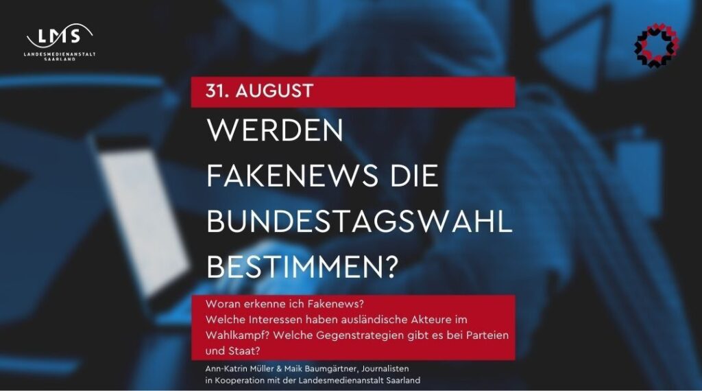 Die Veranstaltung findet in Kooperation mit der Landesmedienanstalt Saarland (LMS) statt. „Die Verbreitung von falschen oder irreführenden Informationen in digitalen, insbesondere sozialen Medien beschäftigt die Gesellschaft und natürlich auch die Landesmedienanstalten bereits seit einiger Zeit. Desinformation attackiert und erodiert mithin den gesellschaftlichen Zusammenhalt im demokratischen Gemeinwesen. Wie wir dem begegnen können – von präventiven Aspekten der Sensibilisierung bis hin zu Aufsichts-, Kontroll- und Sanktionsmöglichkeit – freue ich mich mit den Journalist:innen Ann-Katrin Müller und Maik Baumgärtner zu diskutieren“, so LMS-Direktorin Ruth Meyer.